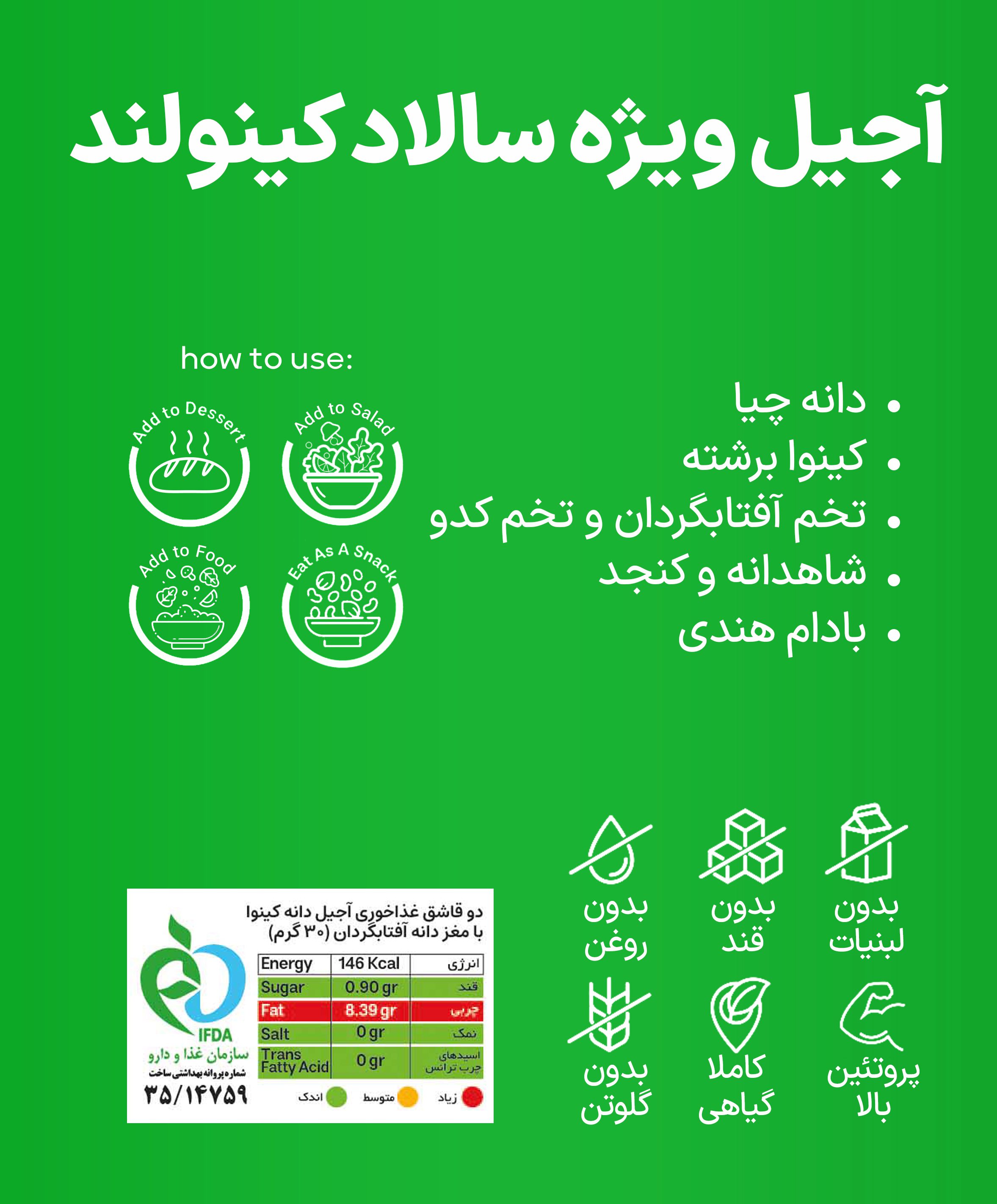 سالادت رو فقط با خیار و گوجه نبند! اگه میخوای یه طعم و ارزش غذایی متفاوت به سالادت بدی، آجیل سالاد کینولند انتخابیه که نباید از دست بدی.