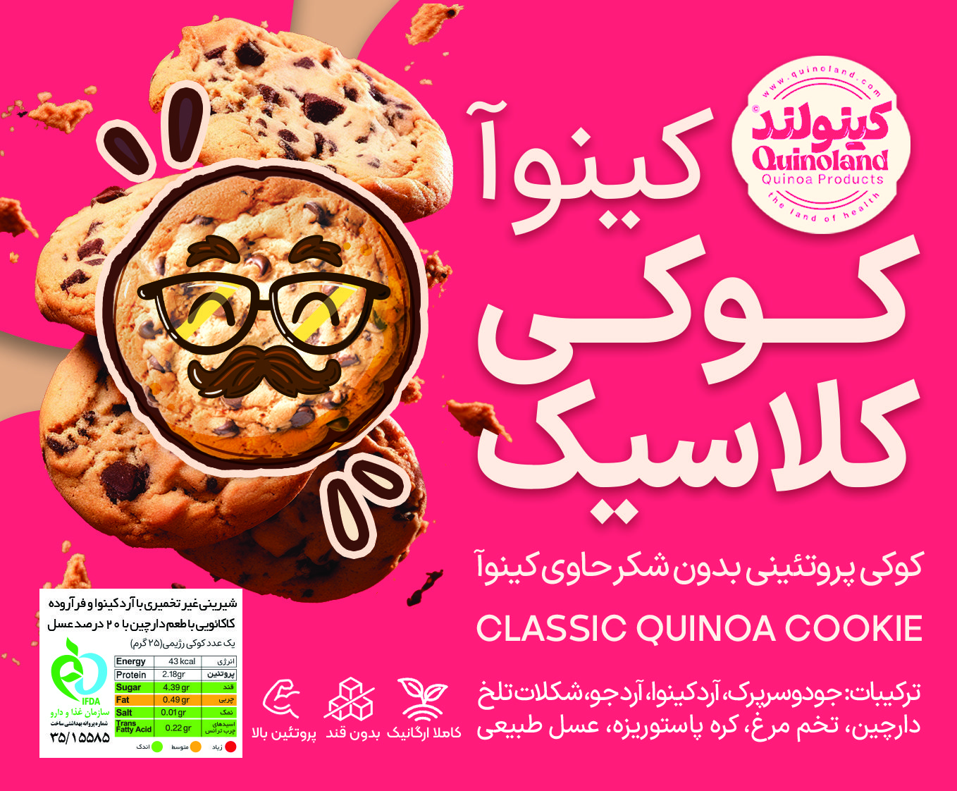کوکی رژیمی کینولند، ترکیبی سالم و خوش‌طعم از آرد کینوا، جودوسرپرک، کره پاستوریزه، عسل، دارچین و شکلات. کوکی رژیمی کلاسیک بدون شکر اضافه و بدون روغن صنعتی؛ میان‌وعده‌ای سبک، سیرکننده و بدون عذاب وجدان.