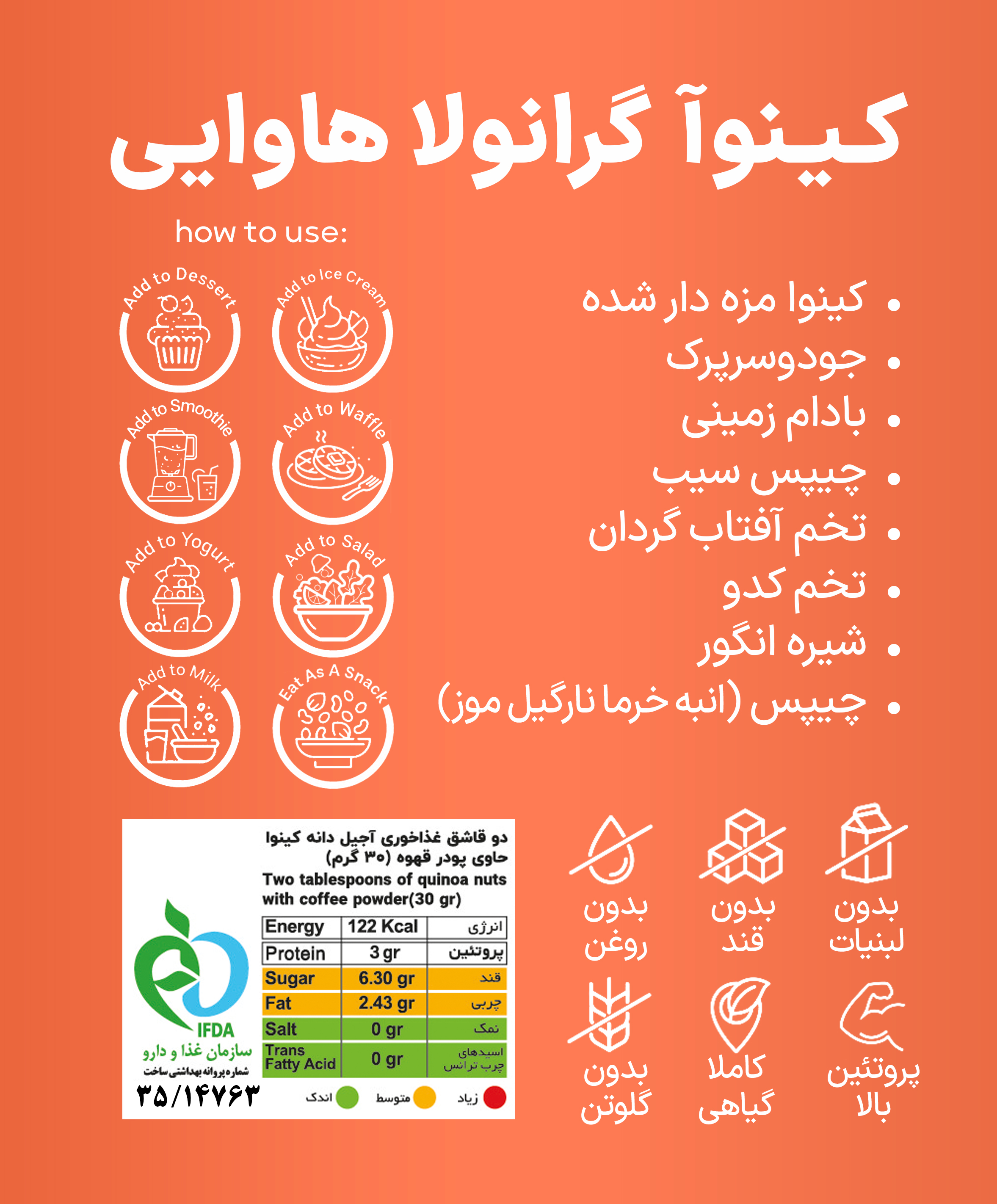 اگه دنبال یه میان‌وعده‌ی سبک، مغذی و کاملاً طبیعی هستی، گرانولا کینوا هاوایی یه انتخاب خاص، کم‌حجم ولی کاملاً پرفکت برای سبک زندگی سالمه. این ترکیب انرژی‌زا از کینوا (خاویار گیاهی)، جو دوسر پرک، پسته، انبه، خرما، موز، نارگیل و تخمه‌ها، یه بریکست یا اسنک حرفه‌ای برای هر تایمی از روز محسوب میشه.